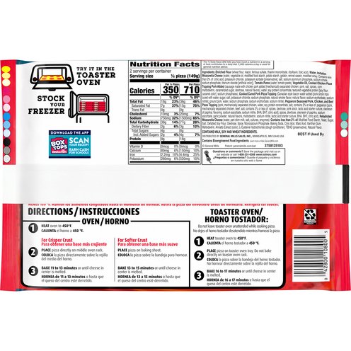 One bite and the party's on! Grab a Totino's Triple Meat Party Pizza loaded with a combo of your favorite meaty toppings, tangy sauce, and gooey cheese. This pizza not only cranks up the flavor, it's also a good source of protein per serving. Sink your teeth into the original crisp crust, plus even meltier cheese compared to our previous recipe. Absurdly tasty and mind-blowingly good, this pizza brings big flavor vibes to your taste buds. Easy to pop in an oven or toaster oven, take it from freezer to table in under 20 minutes. Late night cravings? We got you covered. Last-minute snacks for game day or movie night? Done. Enjoy this savory pizza alongside mozzarella sticks, pizza bagels, corndogs, and other frozen snacks. Keep a few packs in the freezer so your teens and kids can enjoy a quick after school snack. From party time to snack time, add this crowd-pleasing triple meat pizza to your grocery list. Totino's frozen pizzas are a classic that bring all the deliciousness without breaking the bank.