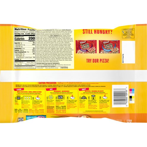 Totino's Triple Cheese Flavored Pizza Rolls turn epic pizza toppings into a tasty, poppable bite you can enjoy any time. Excite your taste buds with a triple cheese flavored filling inside bite-sized pockets of goodness, baked to a golden finish. From chill nights on the couch or gaming with friends to hosting a gameday crowd, Totino's Pizza Rolls are the perfect savory snack. Frozen Totino's Pizza Rolls are ready whenever you are. Heat them up in no time with no fuss. Pop 'em in the microwave, oven, toaster oven, or air fryer, following the easy directions on the package. Ideal for teens, keep a stash in your freezer for when they crave a bite before rushing out. Switch things up by serving alongside your favorite dips or sauces. Make these flavorful pizza flavored snack bites an alternative to frozen pizza. They're fun to eat, so add them to any party spread as an ideal finger food. There's plenty to go around.