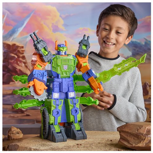 - INTERACTIVE BATTLE FEATURES: The Transformers figure has a spinning buzzsaw blade arm, a working claw arm, and fold-out battle stations in his chest and legs for Cyber Changers figures