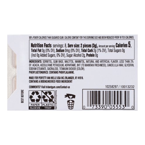 Trident White Spearmint Sugar Free Gum whitens teeth, prevents stains and gives you minty fresh breath. Each piece of this spearmint gum is easy to pop in your mouth and contains 35% fewer calories than sugared chewing gum. For best results, chew two pieces at least four times per day after meals helps remove and prevent stains. These Trident gum packs are individually wrapped to take on-the-go.