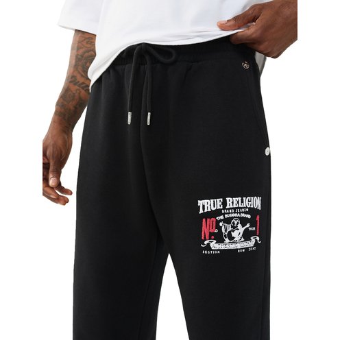 The True Religion World Tour Jogger is laidback but always legendary. Relaxed through the leg, this jogger features a drawstring waist pant, back pocket, and a branded puff print No 1 Buddha graphic on the leg.