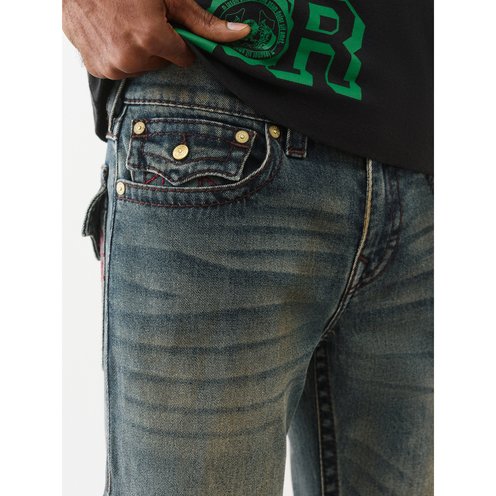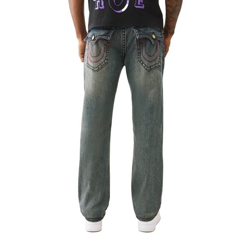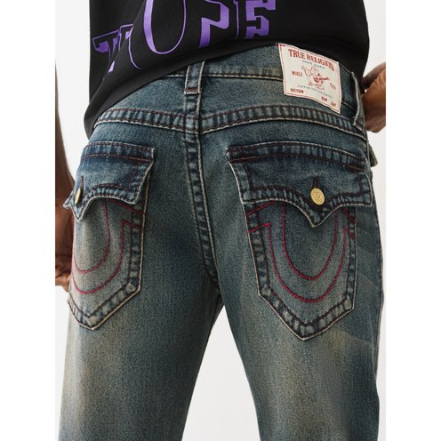 The True Religion Ricky Big T Flap Straight Jean 34" is your new go-to. Relaxed throughout the thigh and leg, these dirty tinted wash jeans feature fading through the legs, whiskering, Big T stitching, gold-toned hardware, and stitched horseshoes on the back flap pockets.