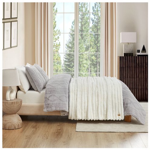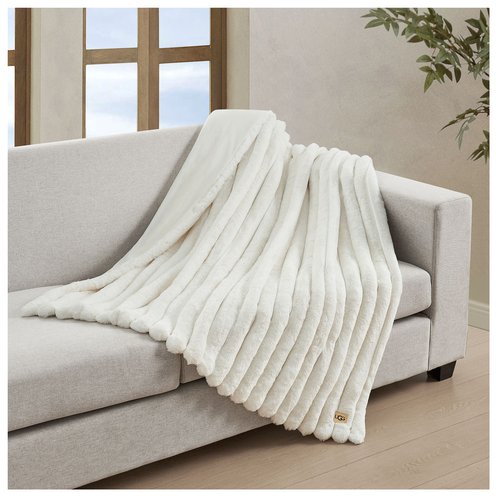The UGG Channel Throw features a frosted channel quilted design and can be reversed to reveal solid faux fur. It measures 50"x70". For easy maintenance, it can be machine-washed in cold water.