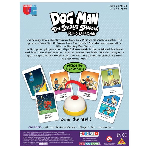 Based on Dav Pilkey’s Dog Man books series, the Dog Man Supa Buddies Card Game is a fast-paced and portable game for kids 5 and up and their families. Players flip Cards at the same time, looking for matching Supa Buddies, the Chief or the SKUNK! Players who identify the matching Cards first win the piles. The player to collect the entire pile of Cards wins the game! Dav Pilkey’s Dog Man series has sold more than 60 million copies. This game includes characters from the book series and the Dog Man Scarlet Shedder book. The Dog Man book series, created by Dav Pilkey, is a wildly popular and humorous graphic novel series that follows the adventures of a part-dog, part-man crime-fighter. Known for its unique blend of action, comedy, and heart, the series is beloved by young readers for its engaging stories and vibrant illustrations. Each book features Dog Man as he battles villains and learns important lessons about friendship, bravery, and kindness.