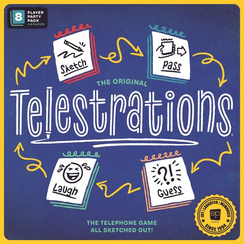 The award-winning party game Telestrations will get your family and friends laughing as they draw what they see, then guess what they saw for hours of hilarious miscommunication. All players simultaneously sketch, pass and guess while revealing laugh out loud and unpredictable outcomes!
