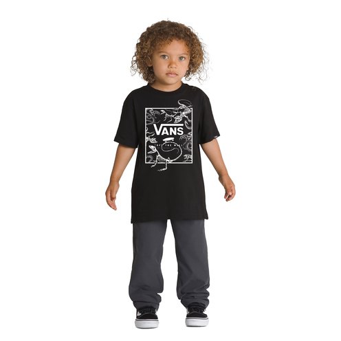 The Little Kids Dino T-Shirt lights up the dark with a graphic that glows long after the sun goes down. Featuring skeleton dinos and the Vans “Off The Wall” logo, this tee adds prehistoric energy to playtime—day or night.