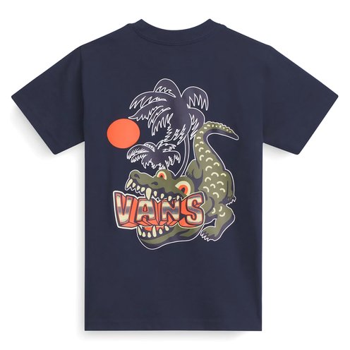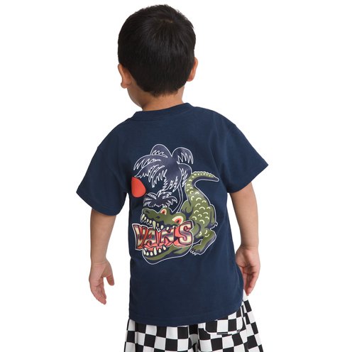 Lightweight jersey T-shirt with bold croc artwork built for little kids' play.Turn up their playtime with a hungry croc graphic that wraps Vans logo attitude onto a soft, lightweight jersey T-shirt, keeping little kids comfy while they run wild all day.