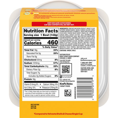 Microwaveable shell pasta with cheese sauce & bacon pieces kit. Per Package: 460 calories; 5 g sat fat (25% DV); 1310 mg sodium (57% DV); 7 g total sugars. 2x the creamy shells. Big bowl. Ready in 5 minutes. Compared to Velveeta Shells & Cheese Single Cup.