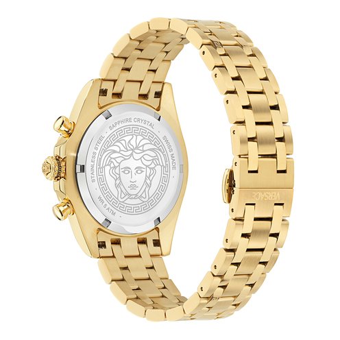Bold and assertive, the Versace Fornax stands out with a striking 3D Greca on the top ring, paired with a subtle textured pattern. The bracelet is adorned with Greca detailing on the center links, adding a signature touch. Featuring a new chronograph movement, this watch seamlessly blends a sporty edge with unmistakable Versace DNA.