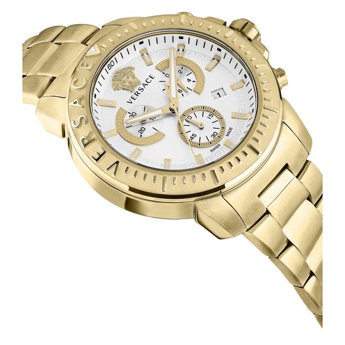 New Chrono is an iconic and bold watch that rediscovers the beauty and charm of the Versace brand DNA. The 45mm case features a sunray dial with a 3D Medusa at 12h and greca detailing around the inner dial and subdials.