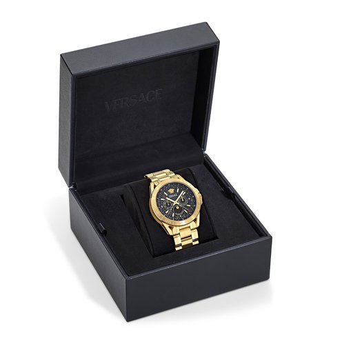 Versace's V-Galaxy Moonphase watch features a sleek round case contrasted with rectangular bracelet links. The Versace logo and iconic medusa head at 12 o'clock signifies the brand's identity. The moonphase window elegantly displays the various phases of the moon on the dial. The bracelet completes the sleek design with the repeated Versace logo on the links.