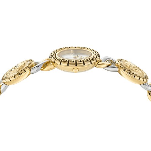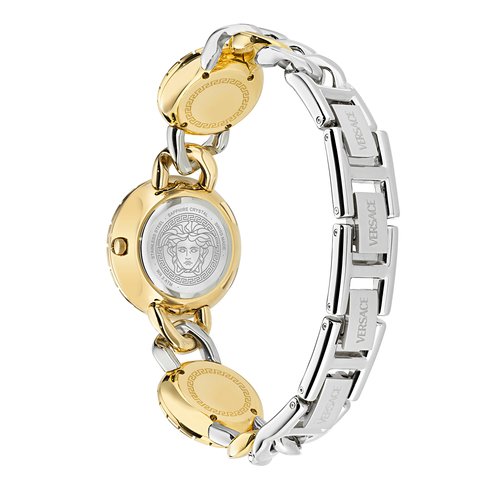 This elegant jewelry timepiece is back with brand new details. Its unique petite case is enriched with the tubular Greca on the top ring and decorative plaques and jewelry bracelet with a bold 3D Medusa at 12h and 6h.