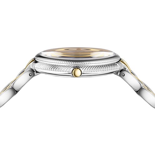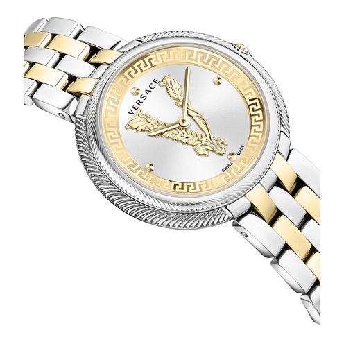 Inspired by the Versace Virtus theme, this timepiece features the iconic "V" baroque on the center of the dial. It fits beautifully on the wrist with either the classic bracelet or embossed leather straps.
