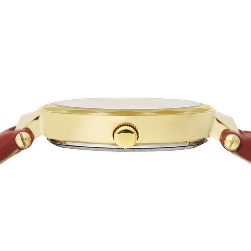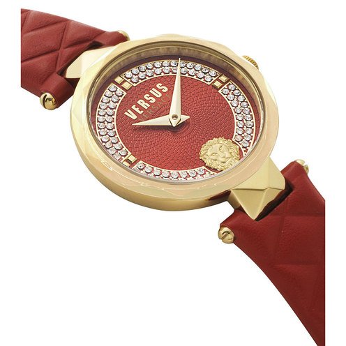 A special execution for the best seller Versus Covent Garden that is now relaunched in brand new look. The new 32 mm slim case body gives to this watch a unique and feminine look feel. The dial is enriched with a strong red guilloche, two Swarovski crystals lines, a 3D lion head at 6 o'clock and Versus Versace logo at 12 o'clock. The diamond cut top ring together with the matelass� leather strap or metal studs bracelet donate a strong personality mixed with an elegant touch. The red details are there to celebrate Saint Valentine and Chinese New Year.