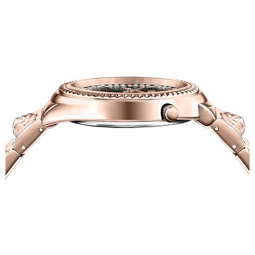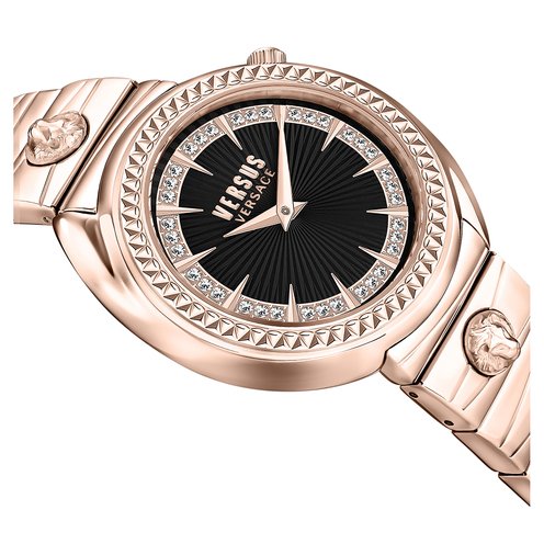 A bold and glamorous look for Versus Tortona. The 38mm case body has unique shape where both the dial and top ring are embellished with a geometrical pattern and lion heads on the bracelet.