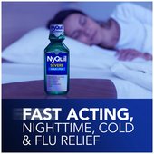 When cold symptoms keep you up, try Vicks NyQuil SEVERE Cold & Flu liquid medicine. Just one dose of this over-the-counter medicine starts working fast to relieve 9 of your worst cold and flu symptoms, to help take you from 9 to none. From the world's #1 selling OTC cough and cold brand, Vicks NyQuil SEVERE provides fast, powerful, maximum strength relief for your worst cold and flu symptoms. Vicks NyQuil SEVERE provides powerful, maximum strength 9-symptom relief to treat coughing, sneezing, stuffy nose, minor body pain, sinus congestion, sinus pressure, sore throat, headache, and fever. Use when you need fast, nighttime relief for your ugliest, roughest, toughest cold symptoms so you can rest. Nothing works faster. Vicks has been trusted for over 125 years to relieve your cold and flu symptoms.