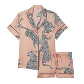 Get your beauty sleep in our glossy set featuring a short-sleeve button-up and matching shorts.