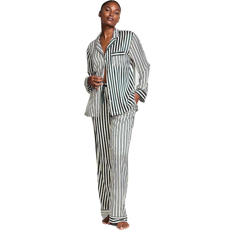 We've upgraded your favorite satin pajamas with a special technique for a unique, shimmery finish*. The long-sleeve top features a chest pocket with logo embroidery. Includes top and bottom. Easy fit. Long -sleeve, button-front.
