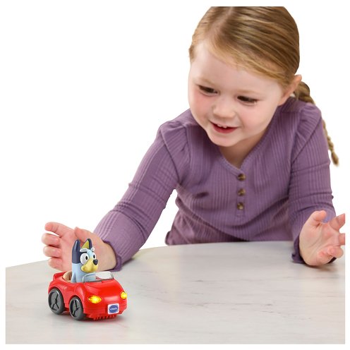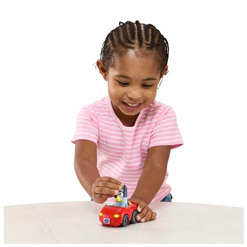 Time for an adventure! Get in a cool car, rev up the imagination and drive around with Bluey in her Escape Convertible. Press Bluey to hear her can-do attitude and keen observation skills in cute phrases from the show, along with delightful songs and melodies. This convertible is sooooo cool! With every response, see the Escape Convertible’s headlights turn on. Place the car on SmartPoint tracks (sold separately) to hear even more responses, for real life. Off we go! Intended for ages 1.5+ years. Requires 2 AAA batteries. Batteries included for demo purposes only. New batteries recommended for regular use.