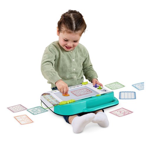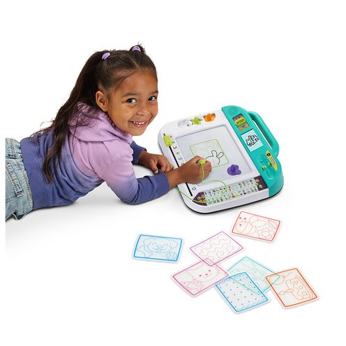 Get drawn into a learning center that shows kids how to write letters, numbers, objects and their own name! Watch the animated demonstrations and follow along with the step-by-step instructions using the stylus. Practice uppercase letters, lowercase letters, numbers 1-10 and 16 shapes. Discover how to draw objects and animals or make masterpieces using three stamps, eight stencils and kid creativity. Draw while listening to different tunes and hear the stylus make silly sounds. Clear it all away for more play by sliding the ABC slider. Intended for ages 3-6 years. Requires 2 AA batteries. Batteries included for demo purposes only. New batteries recommended for regular use.