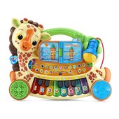 Light up the beat with a giraffe piano! Pick a page in the music book to hear a song and play along, pressing each key as it lights up. Practice 20 different songs with the glowing keys as a guide or go wild and freestyle to create new masterpieces. It’s four instruments sounds in one: switch between the piano, violin, xylophone, and saxophone (even mid-song!) to bring the whole band to life with one giraffe. Use the real microphone to harmonize, perform solo or sing a cappella. Layer in funky sound effects by spinning the DJ scratch pad, or slide the butterfly to change the tempo. Let’s jam! Intended for ages 1.5-4 years. Requires 3 AA batteries. Batteries included for demo purposes only. New batteries recommended for regular use.