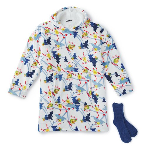 An ultra-soft fleece oversized hoodie with a roomy kangaroo pocket and a playful all-over print featuring skiing avocados in a festive winter scene.
