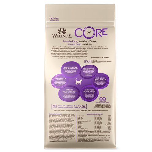 Wellness CORE Natural Grain Free Dry Cat Food Kitten Health Turkey, Whitefish & Chicken Recipe is healthy, 100% natural grain free cat food for kittens made with chicken, turkey, whitefish, salmon oil and cranberries to help support your kitten's optimal health and fortified with antioxidants, probiotics, vitamins and minerals, including fish and flax omega blend for healthy skin and coat and DHA for brain and eye development. Wellness CORE grain free cat food formulas are based on the nutritional philosophy that cats thrive on a diet mainly comprised of meat. Each grain free, nutrient-rich formula provides high quality protein for your cat with no meat by-products or fillers, grain, corn, soy, wheat-gluten or artificial preservatives, colors or flavors.