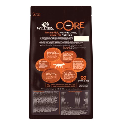 Wellness CORE Natural Grain Free Dry Dog Food Original Turkey & Chicken Recipe is healthy, 100% natural grain free dog food for adult dogs made with turkey, chicken, salmon oil and fruits and vegetables to help support your dog's optimal health and fortified with antioxidents, probiotics, vitamins and minerals, including fish and flax omega blend for healthy skin and coat. Wellness CORE grain free dog food formulas are based on the nutritional philosophy that dogs thrive on a diet mainly comprised of meat. Each grain free, nutrient-rich formula provides high quality protein for your dog with no meat by-products or fillers, grain, corn, soy, wheat-gluten or artificial preservatives, colors or flavors.