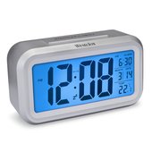 This Westclox digital alarm clock with automatic backlight has so many great and useful features. The LCD display has large time digits that are easy to read. The blue backlight automatically lights up in the dark. It is a soft gentle backlight that will not disturb your sleep. If you prefer, the automatic backlight sensor can be turned off, and allow you to use the backlight on demand. Press the snooze button to briefly illuminate the display for viewing in the dark. The built in calendar displays Month & Date to help you stay on schedule. Also for your convenience is a dedicated Alarm Time and Indoor temperature display. The large snooze button on top is great when you need a few extra minutes of sleep. Requires three AAA batteries to operate (not included).