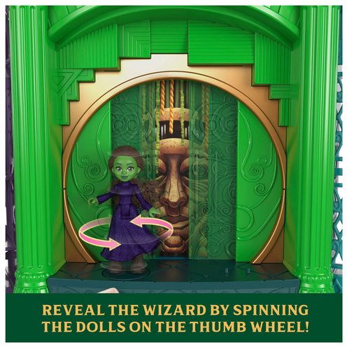 Explore the green and gold metropolis of Emerald City with a playset that features this memorable location, inspired by Universal Pictures’ Wicked! The modular playset comes with two 2.75-inch small dolls – Elphaba and Glinda – 5 play spaces that can be arranged to create different configurations and 15 storytelling accessories to recreate iconic movie moments and beyond. With 360 degrees of play, kids can enjoy days in Emerald City shopping or enjoying a show at Wizomania. Once every inch of the city has been explored, turn Elphaba on the thumb wheel to reveal The Wizard’s iconic mechanical head! Dolls cannot stand alone. Colors and decorations may vary.
