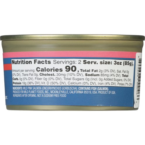Skinless & boneless. Averages 524 mg EPA and DHA Omega 3 per serving. Not a sodium free food. Non-GMO Project verified. Non-BPA lining explained at wildplanetfoods.com/faqs. Sustainably caught in the North Pacific. Product of USA.