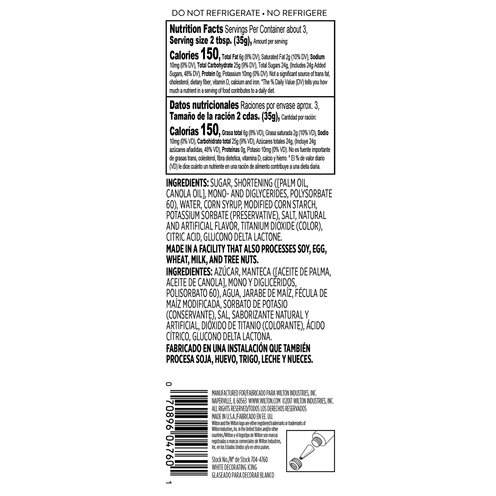 Decorate your treats with ease using this ready-to-use white icing tube. Great for adding decorations to a birthday cake, a batch of cupcakes or some holiday cookies, this easy-to-use frosting tube can be fit with any standard Wilton tip and coupler. No need for a decorating bag! Simply use a standard coupler to attach your tip right to the tube, then have fun piping flowers, stars, borders, shells and more. The vanilla flavor of this frosting compliments almost any cake flavor so your treats are sure to look and taste amazing. When you're done, simply place the cap back on the frosting tube and store it at room temperature until you're ready to use it again.