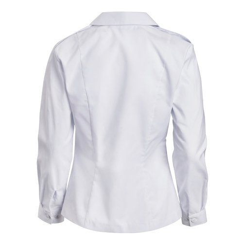 The overblouse shall be worn outside the service dress slacks or optional skirt. The collar should not gap at the neckline; the overblouse should lay smoothly over the bust and hips. Different fit types are available to accommodate different body types. The length shall be long enough to fall approximately one inch above the bottom of the side pocket opening but not extend beyond the service dress coat. The length of the sleeves should cover the wrist bone to allow for proper fit while saluting. All buttons should be fastened and should be loose enough that there is no gapping or wrinkling.