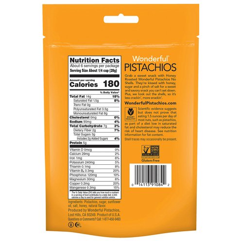Gluten-free. Halal. Heart Healthy: Scientific evidence suggests but does not prove that eating 1.5 ounces per day of most nuts, such as pistachios, as part of a diet low in saturated fat and cholesterol may reduce the risk of heart disease. See nutrition information for fat content. Non-GMO Project verified. Grab a sweet snack with honey roasted wonderful pistachios no shells. They're kissed with honey, sugar and a pinch of salt for a sweet and savory snack you can't set down. Plus, we took out the shells, so it's less crackin', more snackin'. No shells. Product of U.S.A.