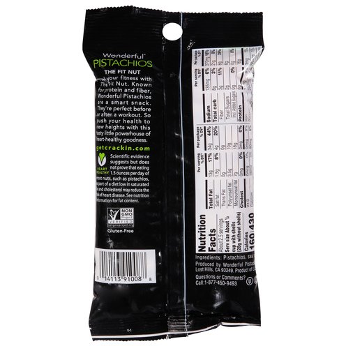 Heart Healthy: Scientific evidence suggests but does not prove that eating 1.5 ounces per day of most nuts, such as pistachios, as part of a diet low in saturated fat and cholesterol may reduce the risk of heart disease. See nutrition information for fat content. Gluten free. Non GMO Project Verified. The Fit Nut: Fuel your fitness with The Fit Nut. Known for protein and fiber, Wonderful Pistachios are a smart snack. They're perfect before or after a workout. So push your health to new heights with this tasty little powerhouse of heart-healthy goodness. Product of U.S.A.
