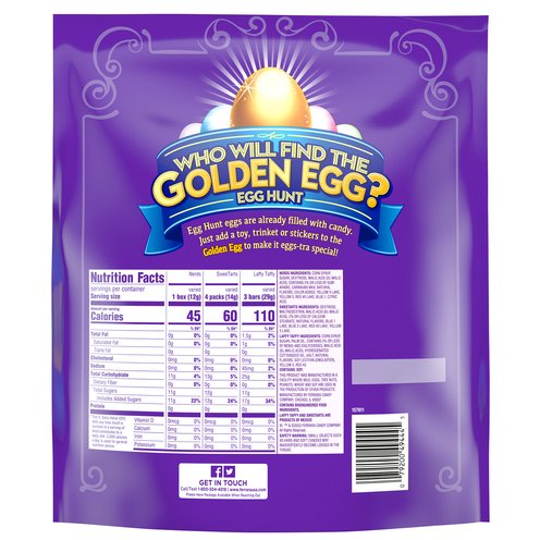PRE-STUFFED PERFECTION: The Wonka Golden Egg mix comes with three (3) favorite candies prefilled in eggs and ready for Easter hunts. The bag contains twelve (12) individual eggs, including one (1) special golden surprise egg. The eggs contain popular Easter basket stuffers, including SweeTARTS, NERDS, and Laffy Taffy.