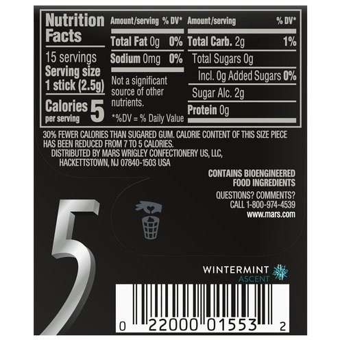 Natural and artificial flavors. Sugarfree. 30% fewer calories than sugared gum. Calorie content of this size piece has been reduced from 7 to 5 calories. Contains bioengineered food ingredients.