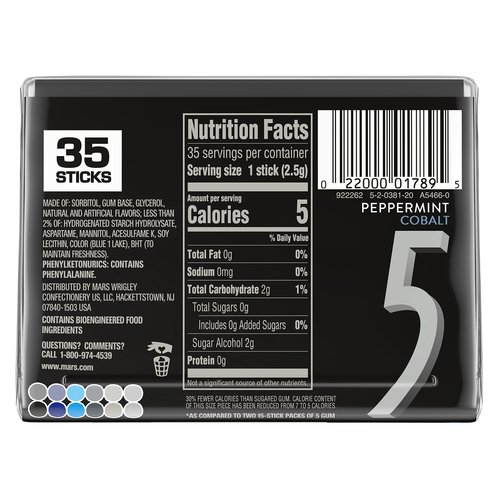 5 Gum Peppermint Cobalt Sugarfree Chewing Gum releases a cool burst of refreshing peppermint flavor with each bite. Wherever you take chances, take 5 Gum along for the ride. Each 35-piece pack has plenty to share with family, friends and coworkers.