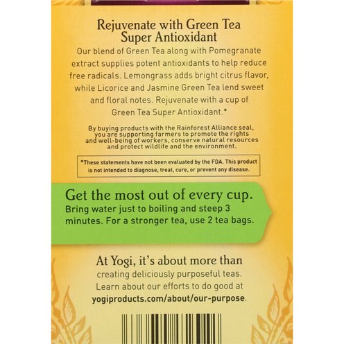 Herbal Supplement. USDA Organic. Certified Organic: Quality Assurance International. Certified Organic by QAI, Inc. Vegan. Contains caffeine. Each tea bad contains approximately 10 mg of caffeine, as compared to approximately 90 mg in 8 oz of coffee. Non-GMO Project verified. Helps reduce free radicals. Rejuvenate with Green Tea Super Antioxidant: Our blend of Green Tea along with Grapeseed extract supplies potent antioxidants to help reduce free radicals. Lemongrass adds bright citrus flavor, while Licorice and Jasmine Green Tea lend sweet and floral notes. Rejuvenate with a cup of Green Tea Super Antioxidant. By buying products with the Rainforest Alliance seal, you are supporting farmers to promote the rights and well-being of workers, conserve natural resources and protect wildlife and the environment. Yoga for Longevity: Lie on your back and straighten legs overhead. Hold onto your toes and gently rock on your back. If you cannot hold your toes, try the ankles or behind the knees. Synchronize your breath with the movement. Hold the pose for 3 minutes. Please ask your doctor if this exercise is suitable for you. Yogi Principles: We blend with intention. Our flavorful teas are created to support body and mind. We believe in the synergistic benefit of herbs, combining ingredients to enhance their wellness-supporting potential. We blend the best of what nature has to offer using the finest spices and botanicals from around the globe. Each tea bag contains approximately 15 mg of caffeine, as compared to approximately 90 mg in 8 oz of coffee. yogiproducts.com. At Yogi, it's about more than creating deliciously purposeful teas.