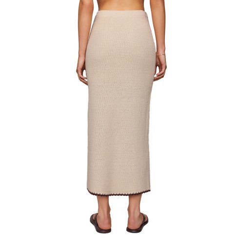 This midi length skirt stands out with contrast color trim, yarn blend fabric, and a flattering silhouette. Make it a set with the Yessenia Whipstitch Tank.
