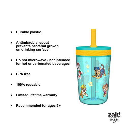 This fun straw tumbler will keep kids hydrated without any fuss! Let's keep it simple: this tumbler doesn't leak. The silicone sipper spout has a built-in valve that stops water from flowing when no one is drinking, so it's easy for children to quench their thirst but won't make a mess if the tumbler is tipped over. It's the perfect choice for active kids, or young ones just graduating from sippy cups who aren't ready for an open-topped tumbler yet. The antimicrobial drinking spout helps prevent the spread of bacteria, so you don't have to worry when you take this travel cup on the go, and the 15-ounce plastic tumbler is lightweight and sturdy enough for everyday adventures. The materials are completely BPA free and shouldn't be microwaved - this cup is made for cold drinks. And at the end of the day, you can just disassemble the lid and spout and put everything in the top rack of the dishwasher for a quick and easy clean.