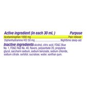 Active Ingredients: Acetaminophen (1000 mg), Pain Reliever.; Diphenhydramine HCI (50 mg), Nighttime Sleep-Aid. Inactive Ingredients: Alcohol, Citric Acid, FD&C Blue No. 1, FD&C Red No. 40, Flavors, Polysorbate 20, Propylene Glycol, Saccharin Sodium, Sodium Benzoate, Sodium Chloride, Sodium Citrate, Saccharide Isomerate, Sucralose, Water, Xanthan Gum.